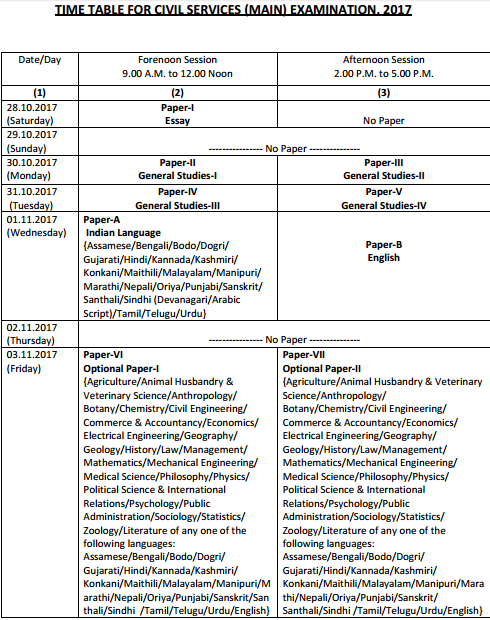 Civil Services (Main) Examination, 2017 Time Table released in online at http://upsc.gov.in....